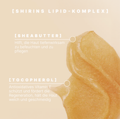 - Sheabutter – pflegt deine Haut intensiv, macht sie seidig-zart und versorgt sie nachhaltig mit wertvollen Lipiden